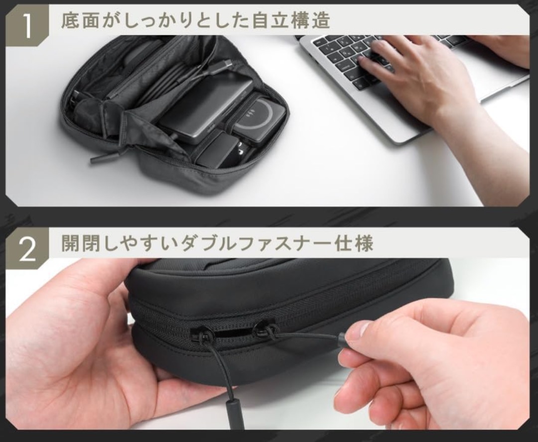 最大の特徴は180度フラットに開くパノラマオープン設計。ファスナーを引ききるとポーチが完全に平らに展開し、中身がすべて視野に入ります。「あのケーブルどこだっけ」と手探りする手間がなくなるのは、毎日の使い勝手に効くポイント。
