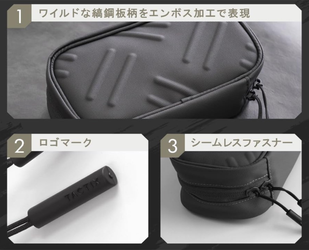 オウルテックのアーバンミリタリーブランド「TACTIX(タクトナイン)」から、180度パノラマオープンのガジェットポーチが登場。縞鋼板柄のテクスチャーと大容量収納を両立した、ガジェット持ち歩き派には良さそうです。