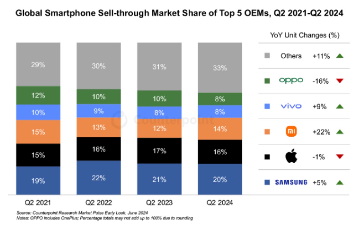2024年第2四半期スマートフォングローバル市場は前年比6%の成長。Appleはマイナス1%。