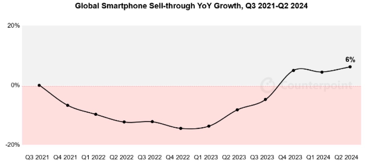 Counterpoint Research HKによる2024年第2四半期スマートフォングローバル市場の調査結果によると、セルスルー(消費者への販売)は前年同期比6%の伸び。