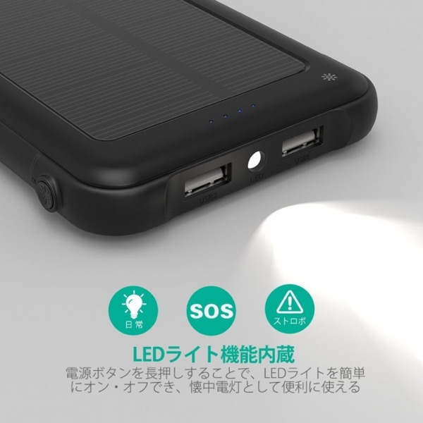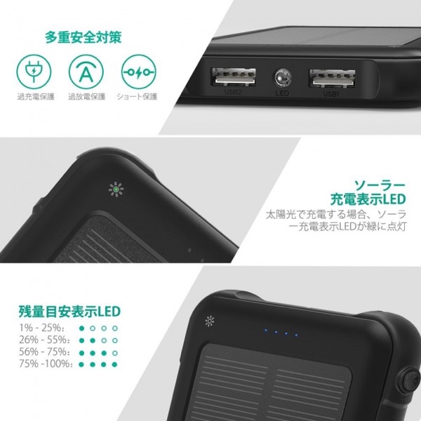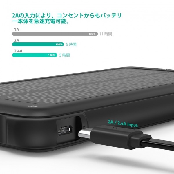 「RP-PC082」は、太陽光充電と通常の2A/2.4A入力の二つの充電方法を備える、10000mAhモバイルバッテリーです。