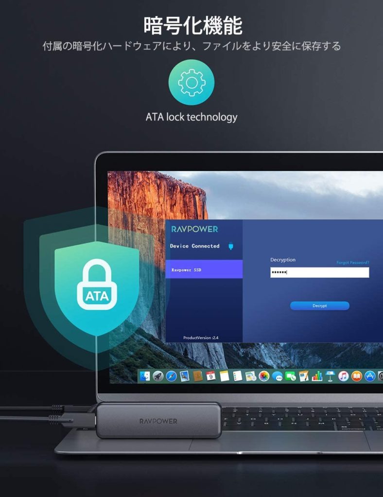 また、ATAパスワードロック技術搭載のMac/Windows用暗号化ソフトがプリインストールされています。