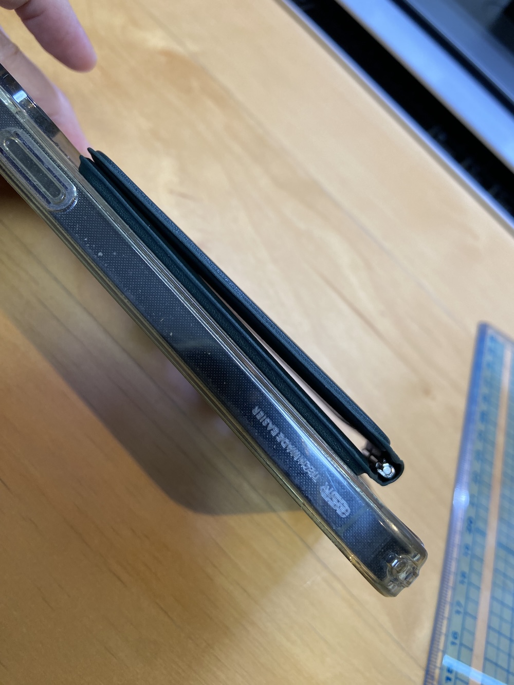 ヒンジが下になっている構造ゆえに、”落下防止”的な観点からは、ちょっと弱いかも。ただ、何もつけていないよりは、落としそうになった時の滑り止めにはなります。