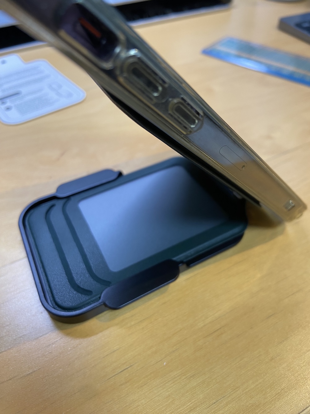 ほとんどのMagSafeウォレットは折りたたむヒンジ部分はiPhoneのカメラ側、つまり上部になりますが、この「Phone Stand Wallet」は下側になります。