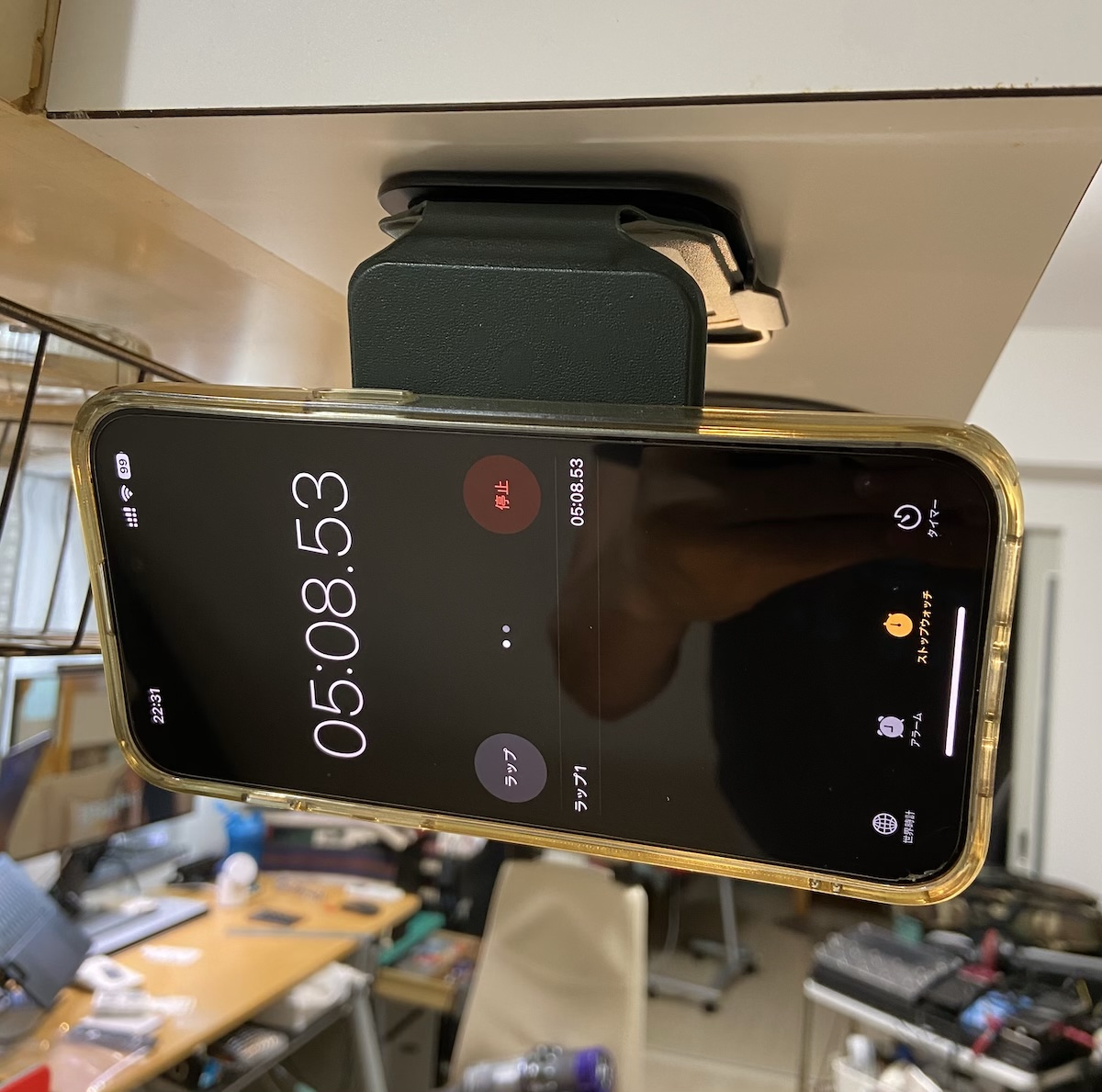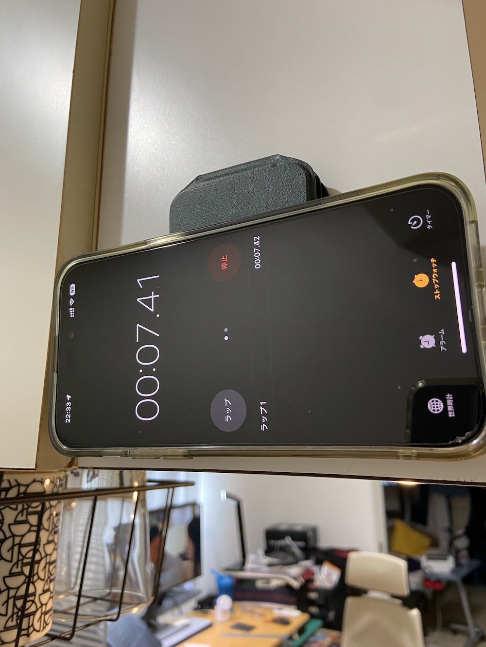キッチンの上の壁に取り付けてストップウォッチオン。