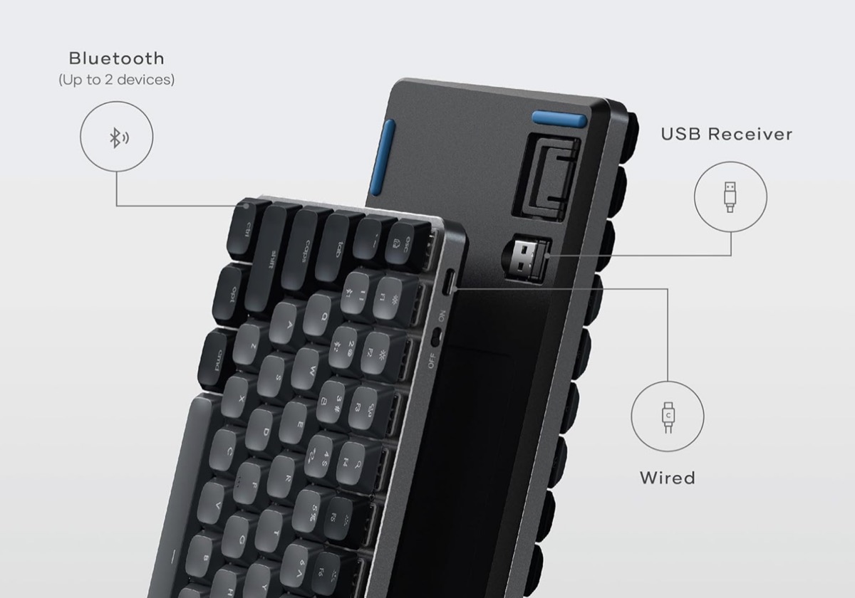 Bluetooth、2.4GHz USBレシーバー、有線接続が可能な外付けキーボード。