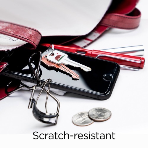 ナイフなど鋭利なものとの接触でも傷つきにくい硬度9Hの耐久性と、破損時も破片が飛び散らない安全設計となっています。