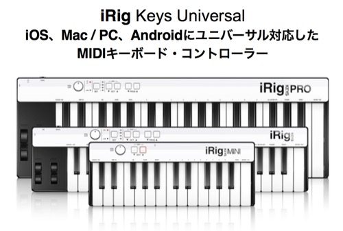 iOS、Android、Mac OS X、WindowsのマルチOS対応で、37鍵フルサイズ鍵盤を装備したMIDIキーボード・コントローラー「iRig Keys PRO」、37鍵ミニキーボード「iRig Keys」、25鍵ミニキーボード「iRig Keys Mini」のiRig Keys Universalシリーズ。