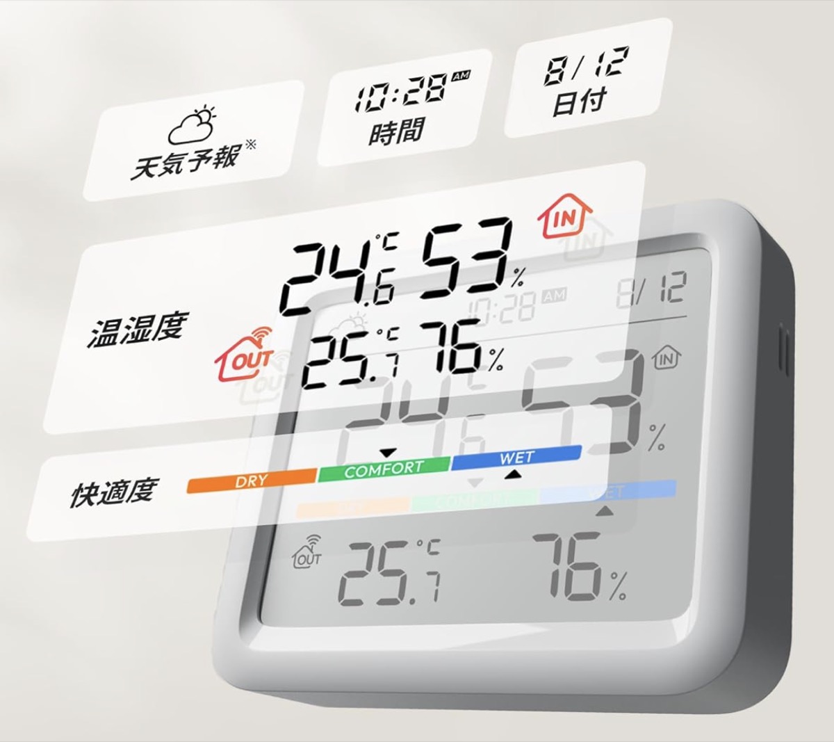 温湿度、快適指数、天気、日時を一覧表示します。