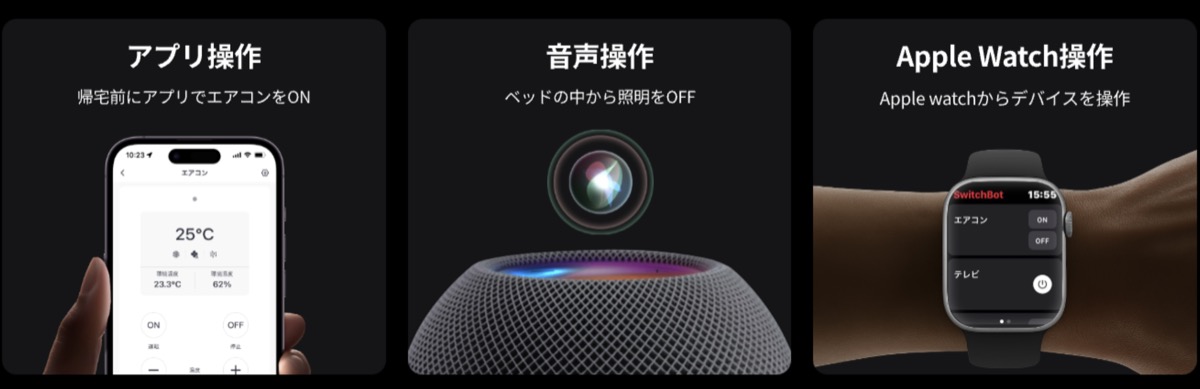 スマートフォンアプリ、スマートスピーカー経由の操作、Apple Watchからの操作も可能。