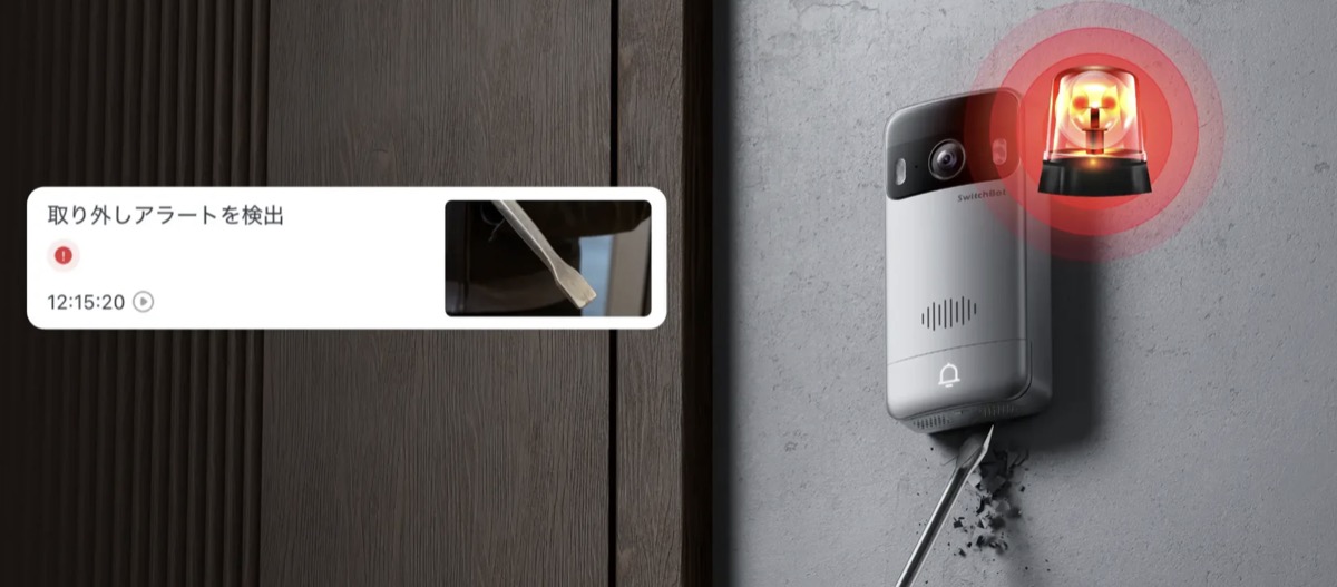 玄関子機が取り外しされた時に大きな音で警報を鳴らし、アプリに通知を送信することもできます。