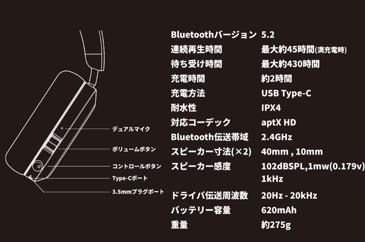 40mm、10mmのデュアルドライバー、パッシブノイズキャンセリング(遮音のみ)、aptX HDコーデック対応。