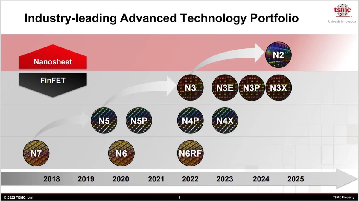 すでにTSMCは、2023年に3ナノメートル技術のロードマップを公開していて、そこには第一世代のN3、第二世代のN3E、第3世代のN3P、第四世代のN3Xがあり、タイミングとしてはN3Xと同時にN2がリリース予定。