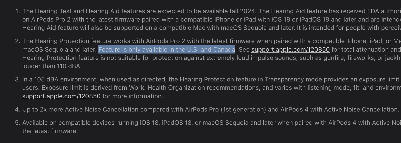 なお、USのAirPods Pro 2 – Hearing Health – Appleのフットノートには、「Feature is only available in the U.S. and Canada」という記述があり、一部メディアで「USとカナダだけ」と伝えていますが、今の所は日本のページには記載されていません。