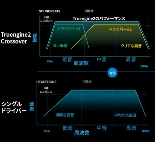 異なる周波数の音声シグナルを別々のドライバーへ送ることでバランスよく分離し、高音質を実現しています。