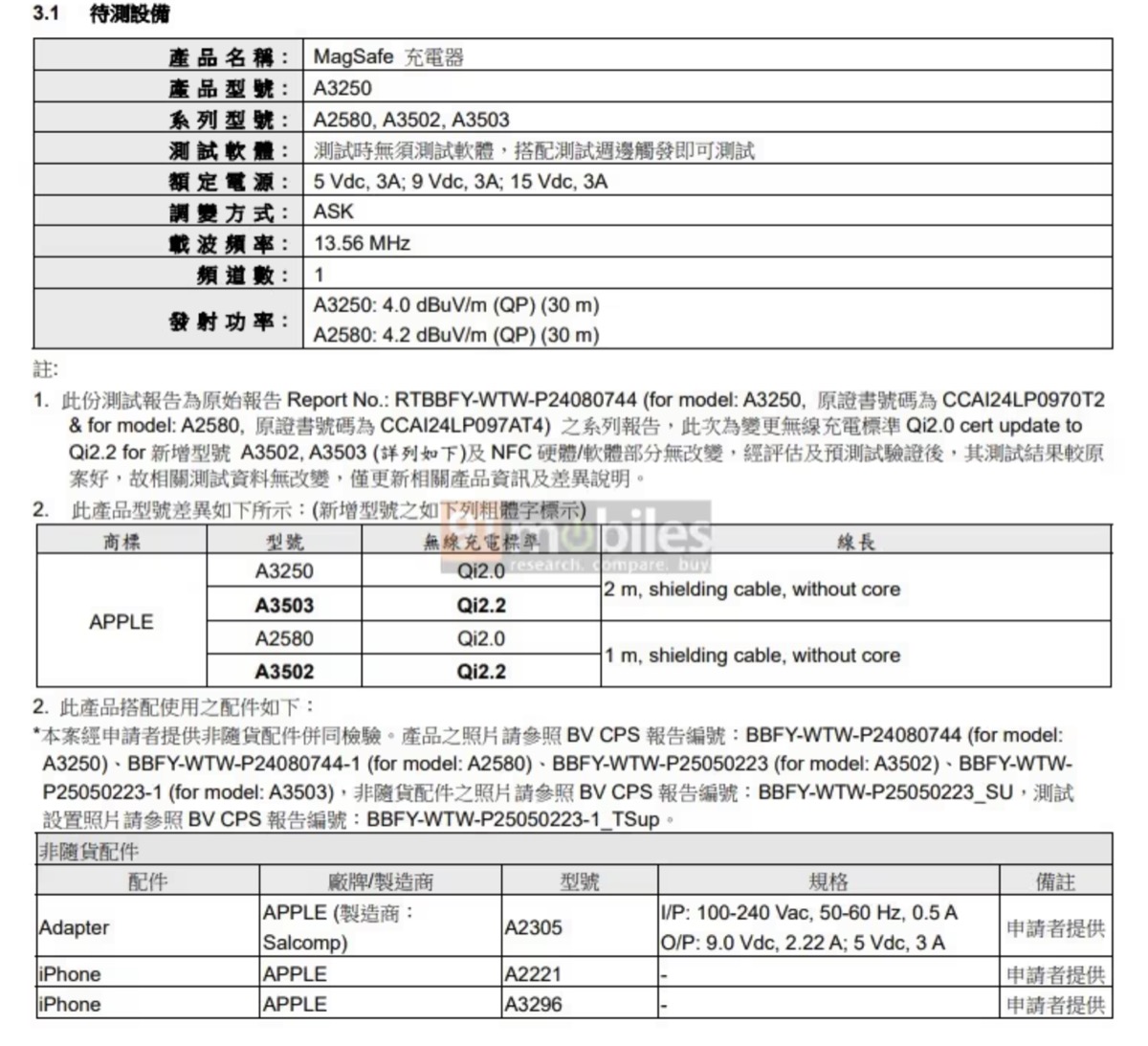 Qi 2.2対応のApple MagSafe充電器「A3503」および「A3502」が発見されました。
