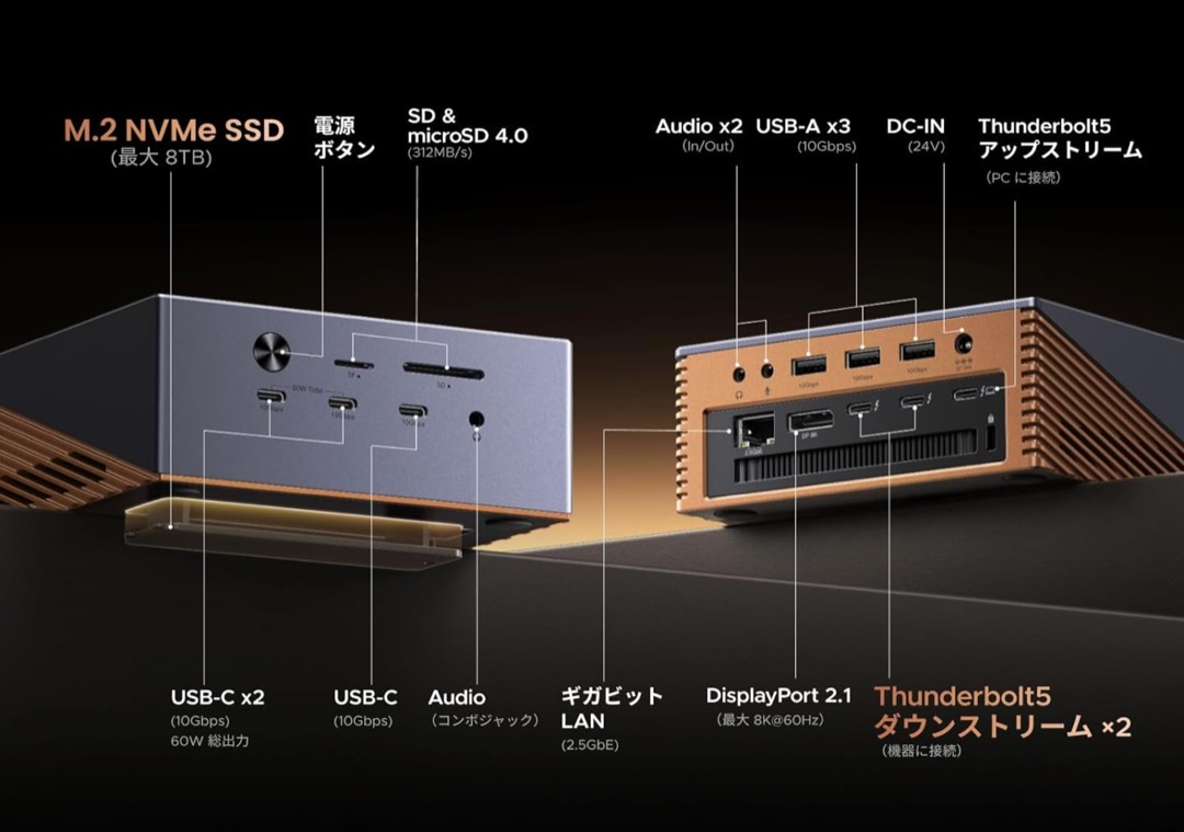 ポートはThunderbolt 5 × 2、DP2.1、USB-A3.2 × 3、M.2 NVMe PCIe 4.0(最大8TB)、SD 4.0/microSD 4.0。