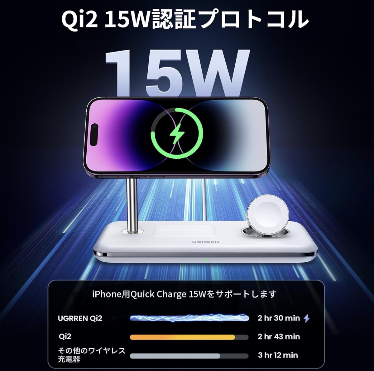 そして、フォーカルポイント株式会社が、UGREENの国内販売代理店として、「UGREEN 3-in-1 ワイヤレス充電器 90326」の販売開始。