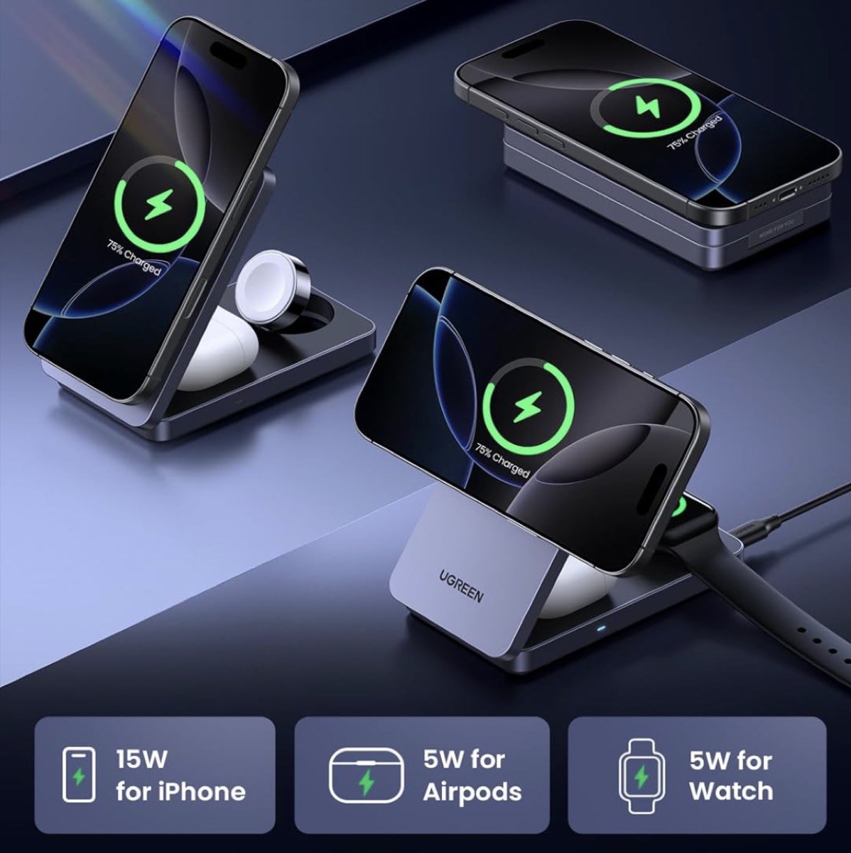 なお、参考までにAmazonでは「UGREEN 3 in 1 MagFlow ワイヤレス充電器」という製品もあります。