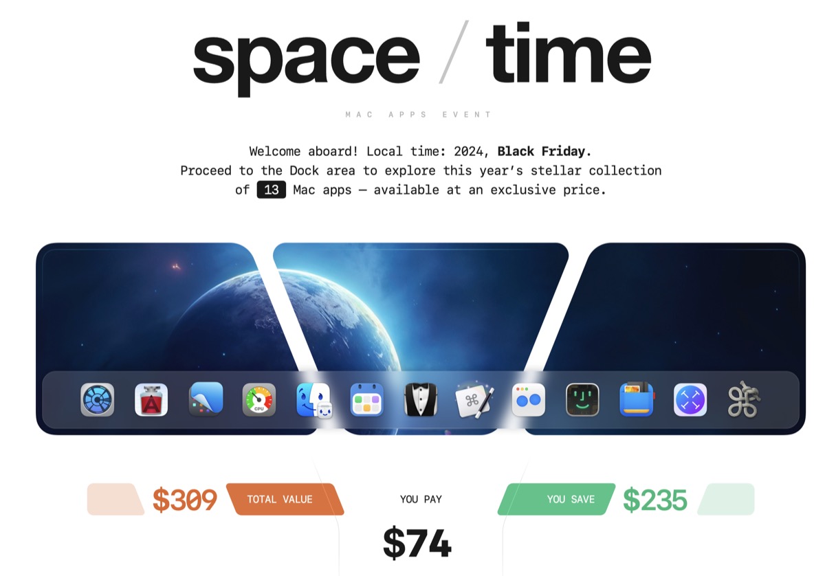 加えて、13種類バンドルの「space/time — a collection of 13 stellar Mac apps」は79ドル。通常309ドル相当。