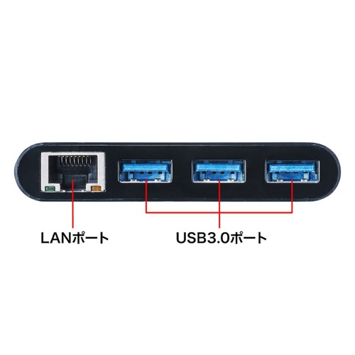 3ポートのUSB3.0ハブとしてUSBフラッシュメモリなどのデータストレージとの高速データ通信やマウスなど各種USB機器が接続可能で、外出先で有線LANを接続する必要がある場合にも利用できます。