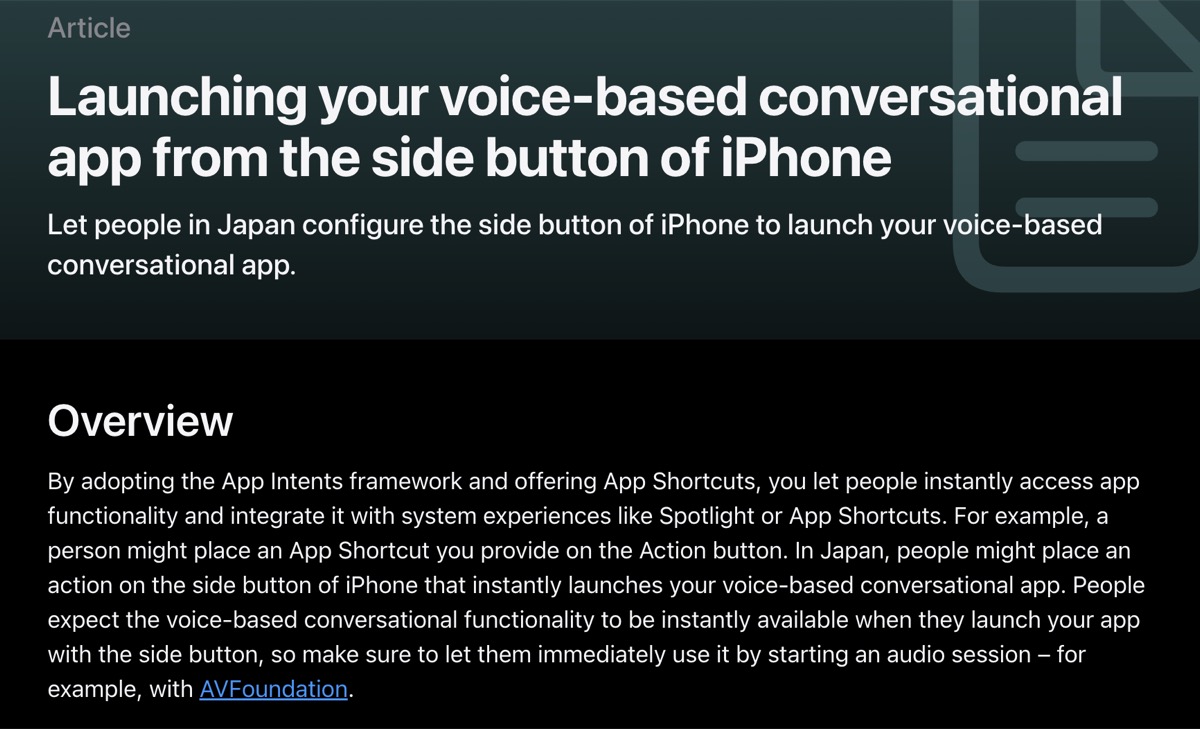 原文は「In Japan, people might place an action on the side button of iPhone that instantly launches your voice-based conversational app.」。